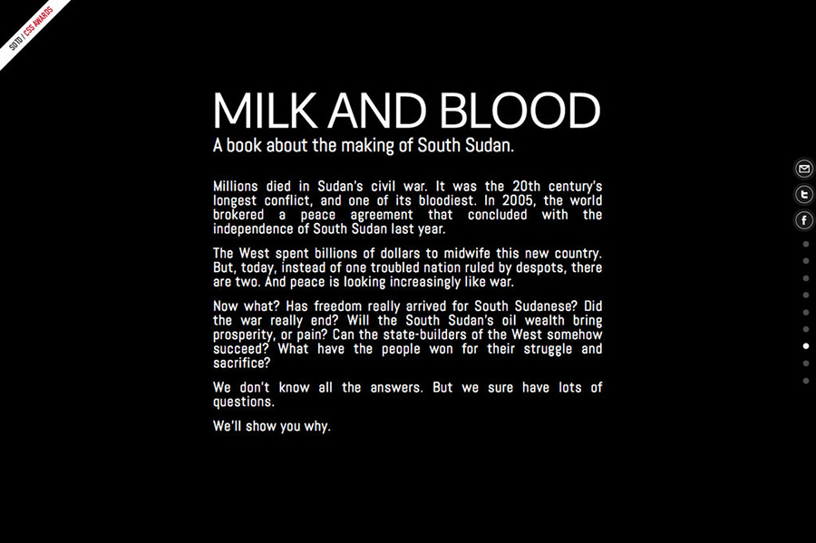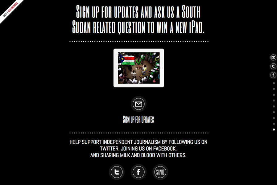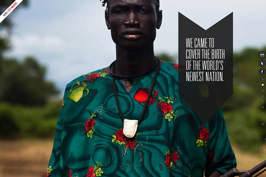 Como consecuencia del trabajo en Nuba Reports, Marina y Pablo Segnini diseñaron esta landing page para dar visibilidad al nacimiento de un nuevo estado, la República de Sudán del Sur. La misma fue nominada al “Site of the day” para los premios Awwwards. awwwards.com/