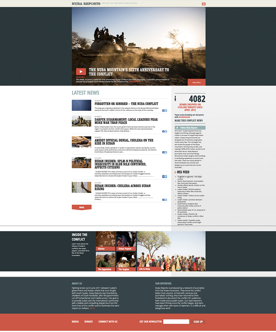 International Refugee Rights Initiative, New York, daba visibilidad al conflicto armado entre Sudán y Sudán del sur. Exactamente en las montañas de Nuba, Kordofán, donde un grupo de periodistas de la revista Times y fotógrafos sociales habitaban para hacer la cobertura del problema bélico. A cargo de Marina, junto a Pablo Segnini, la web que diseñamos en varias versiones y plataformas. www.nubareports.org