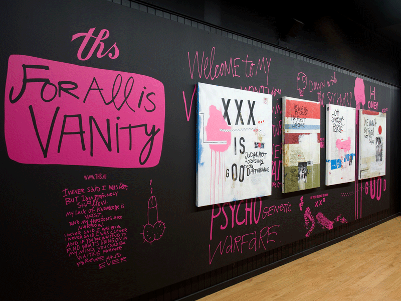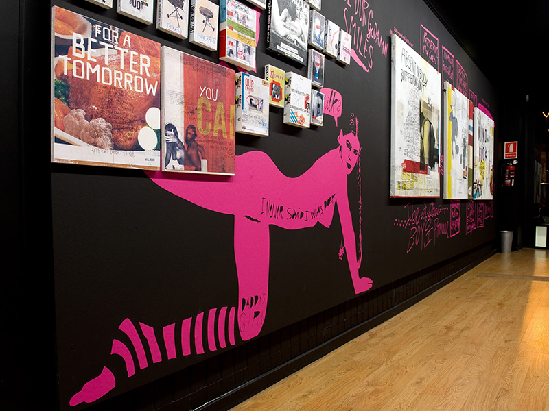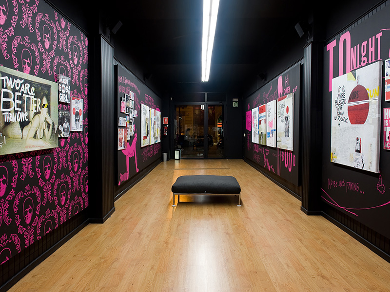 En este caso la producción fue para este artista alemán que llenó las paredes de la ex Galería Rojo en Bailèn, 86. La producción en vinilo adhesivo fucsia para las paredes negras de la galería y el mapa de instalación para cada una de ellas estuvo a cargo de Marina.