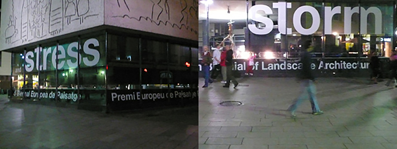 Storm and Strees fue la obra para la 5 Bienal Europea de Arquitectura en el El Col·legi d’Arquitectes de Catalunya y Marina estuvo a cargo de la producción de los vinilos para pared y escaparates.